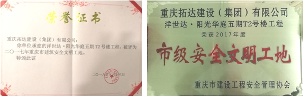 2018年3月16日,經(jīng)重慶市建設(shè)工程安全管理協(xié)會(huì)嚴(yán)格甄選,洋世達(dá)·南濱特區(qū)(陽光華庭五期)二區(qū)T2號(hào)樓項(xiàng)目榮獲“2017年度市級(jí)安全文明工地”的稱號(hào)。
